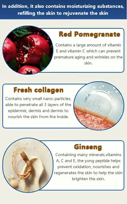 Formulated with red pomegranate, ginseng, and fresh collagen to boost skin vitality, improve elasticity, and deeply nourish for a smoother, glowing complexion.